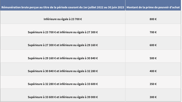 - La prime pouvoir d’achat est une prime exceptionnelle dont le montant brut est de 300 à 800€ en fonction du salaire de référence que vous avez perçu entre juillet 2022 à juin 2023.
